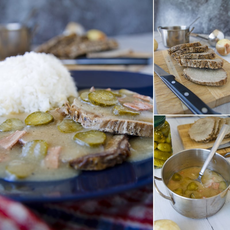 Následně stačí vyndat maso, vavřín, hřebíček a pepř, maso ještě teplé osolit (když ho osolíte dřív, bude pouštět masové šťávy do omáčky, což sice přidá omáčce, ale maso bude suché, jak cesta), všecko ostatní přepasírovat. Hrnec vymýt, na tuku zarestovat na kostičky nakrájené okurky, zalít přepasírovaným jusem, legírovat máslem (nebo rozšlehanými žloutky, nevím, co z toho je, či není „fit“, jo, netuším, co to slovo má znamenat), dosolit, dopepřit. A jestli to jídlo nemůže bez mouky žít, tak orestujte okurky, vyndejte, zaprašte moukou, opečte na roux, a následně zalijte přepasírovanou omáčkou a vraťte okurky.